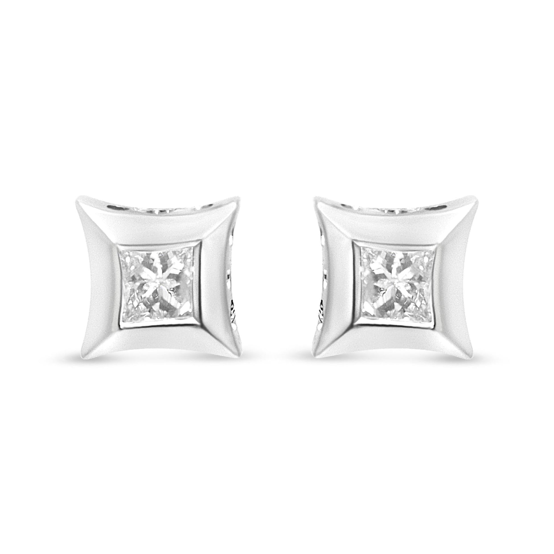 Immerse yourself in the understated elegance of these 10K white gold stud earrings, each holding a princess-cut natural diamond that dazzles with an almost magical aura. The unique invisible style setting creates a riveting illusion of a singular, larger diamond, making each piece not just a statement of style but a masterpiece of optical enchantment. These studs radiate unparalleled brilliance, their H-I color and SI2-I1 clarity casting a spell of light with every turn of your head. The geometric depth and clean lines frame your features in a light most favorable, secured effortlessly by friction backs that promise ease with enduring style. Perfect for anyone looking to add a touch of sophistication to their ensemble, these earrings offer not just jewelry but a portal to a world of timeless glamour.