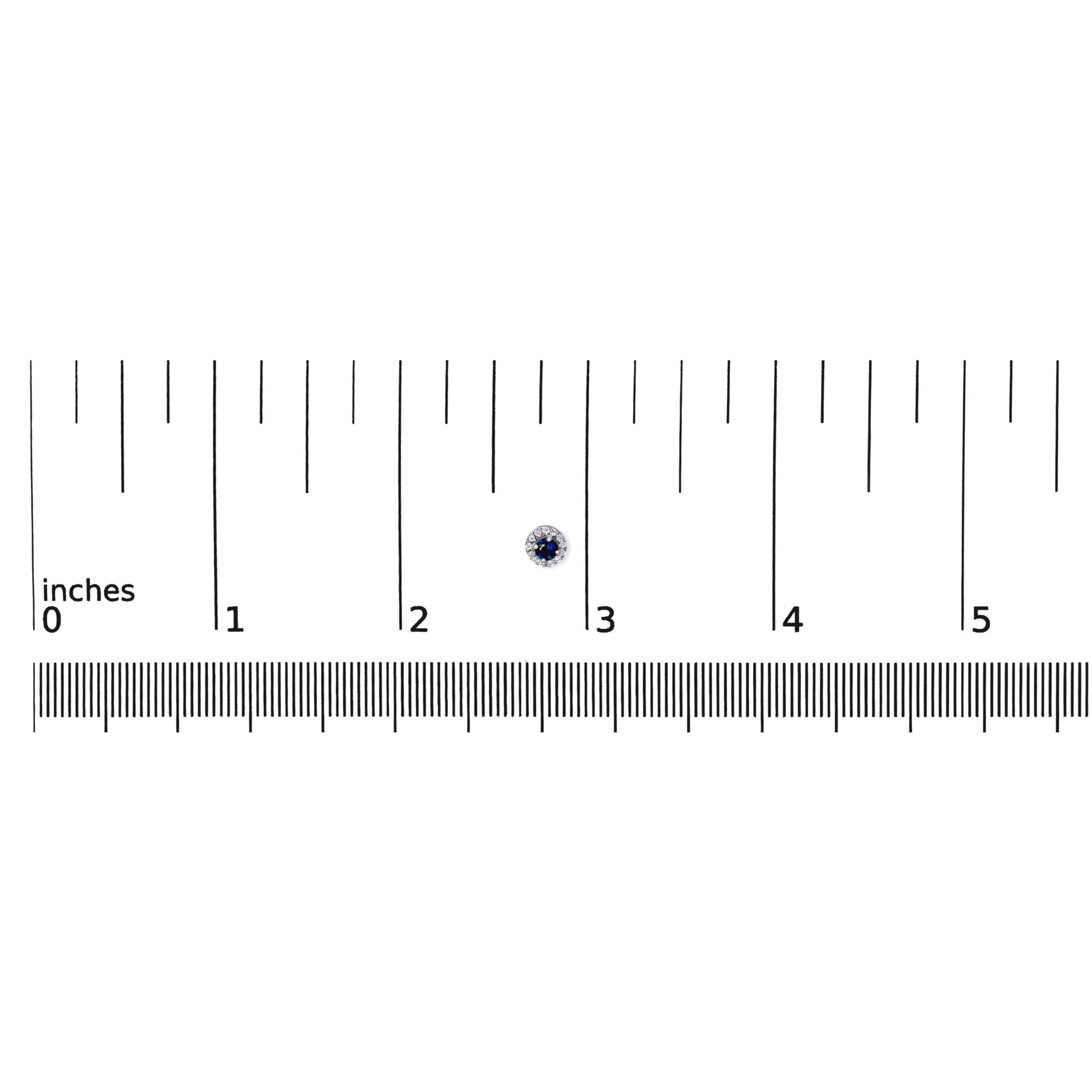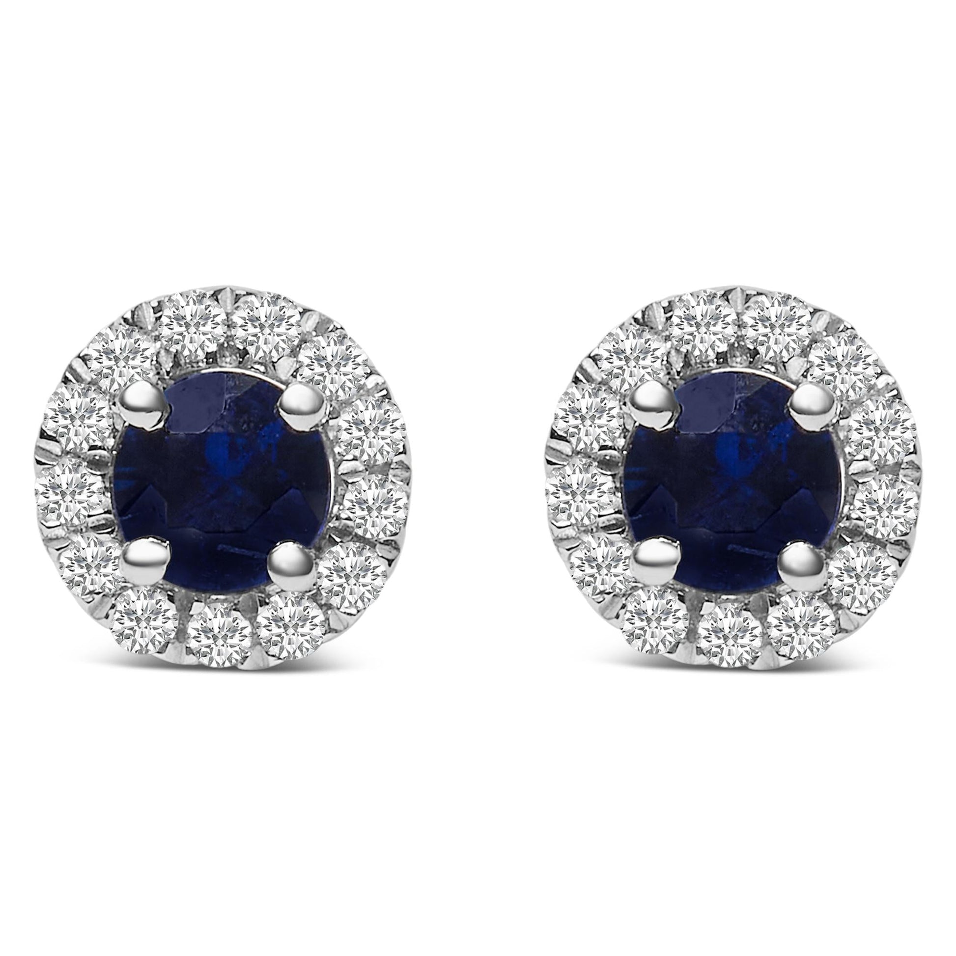 Indulge in the symphony of light and color with these exquisite 10K white gold earrings, beautifully highlighted by the natural allure of deep blue sapphires, naturally sourced, and meticulously crafted without any treatment, ensuring their pristine and authentic beauty shines through. Each earring centers a luscious 3.25mm blue sapphire, encircled by a radiant halo of natural diamonds, collectively weighing 1/10 carat, boasting an I-J color and I1-I2 clarity. This enchanting constellation is designed to mimic a grander solitaire, casting a spherical illusion that magnifies its mesmerizing impact. The durable rhodium plating enhances the white goldâs brilliance, ensuring lasting gleam and sophistication. Secure pushbacks provide peace of mind for these treasures of refined elegance, destined to elevate any ensemble, captivate onlookers, and resonate with the wearer's refined taste.