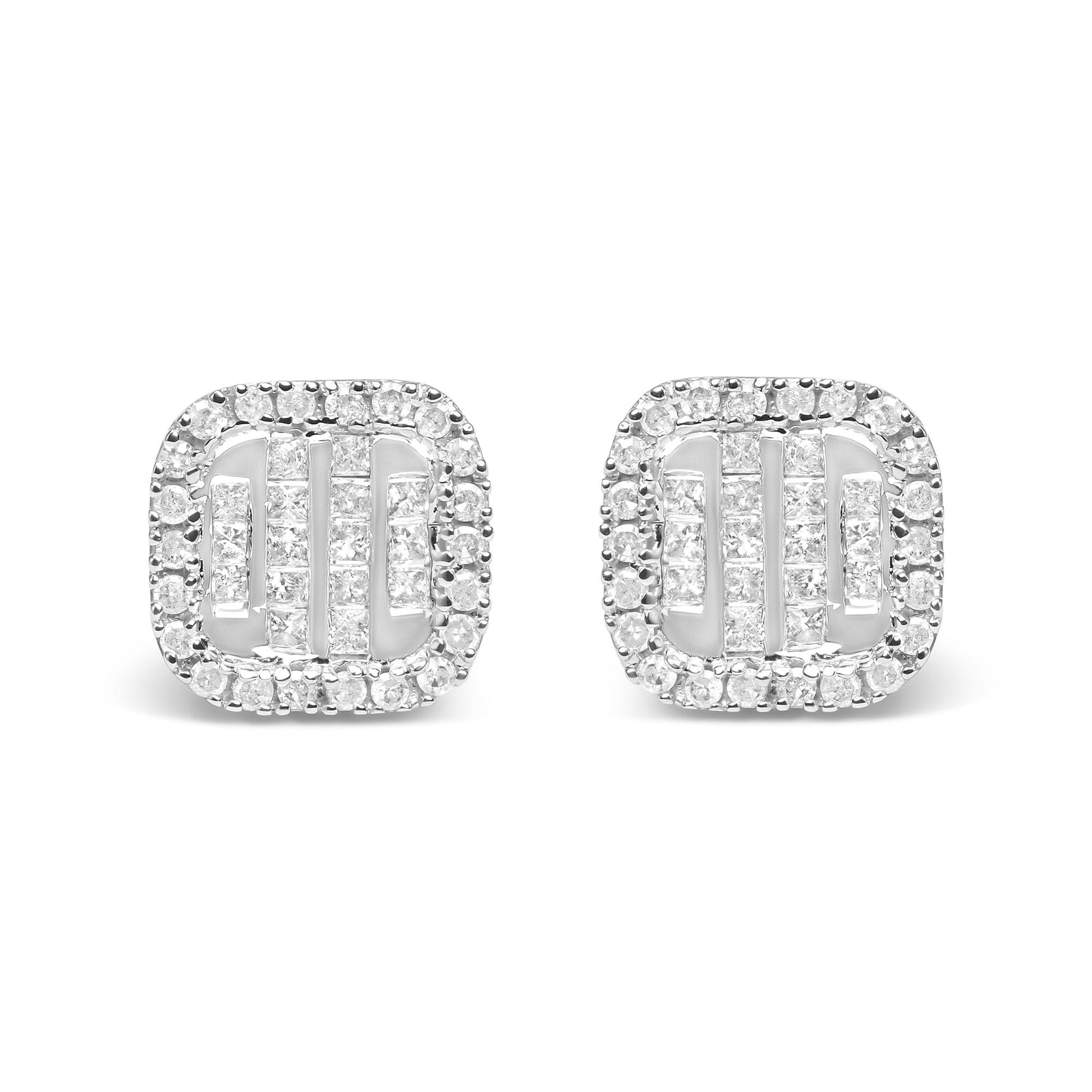 Discover the epitome of elegance with these exquisite stud earrings, meticulously crafted from rhodium-plated 10K white gold that promises durability with a luminous finish. At their heart, princess-cut natural diamonds dazzle in an innovative invisible setting that gives the illusion of a single, seamless stone, adding a touch of understated luxury. These central gems are thoughtfully recessed, lending depth and an intriguing play of light. Encircling this pristine core is a radiant halo of round natural diamonds, their collective sparkle creating a spectacular frame that commands attention. Each earring is designed for comfortable wear, secured by a reliable push back closure. Whether for a glamorous evening or as a sophisticated daily wear piece, these earrings are a brilliant celebration of craftsmanship.