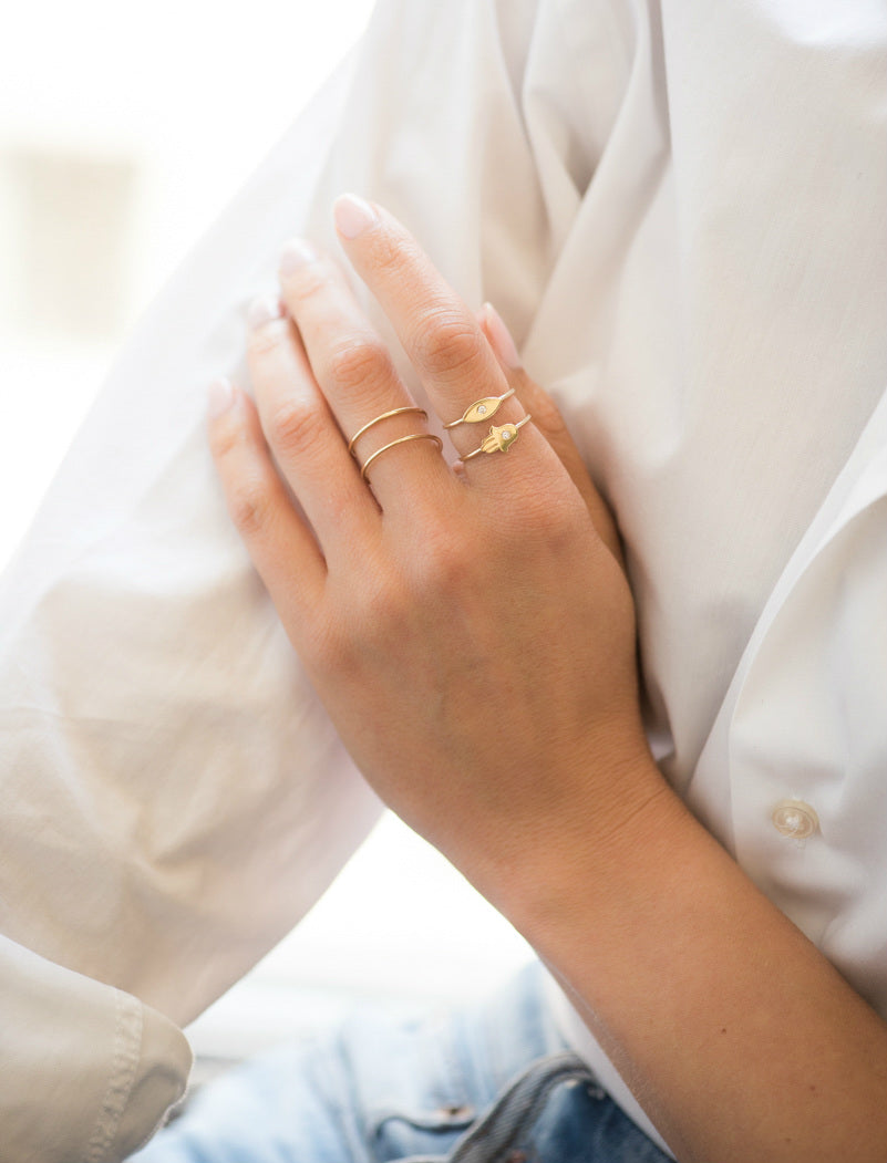 A modern take on a timeless talisman. This 14k Gold Evil Eye Ring features a sleek marquise-shaped eye adorned with a brilliant diamond center, symbolizing protection and clarity. Minimal and meaningful—perfect for everyday wear.