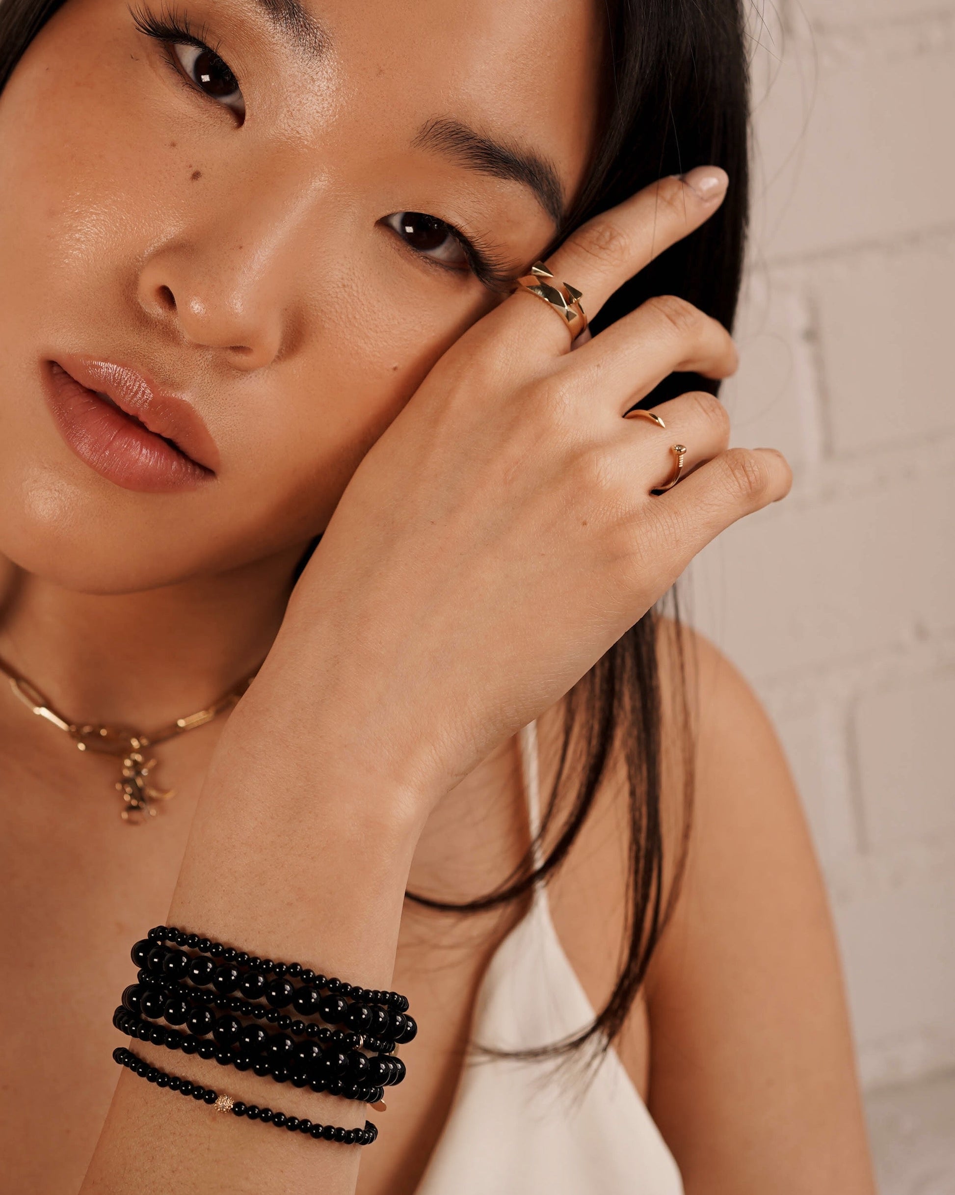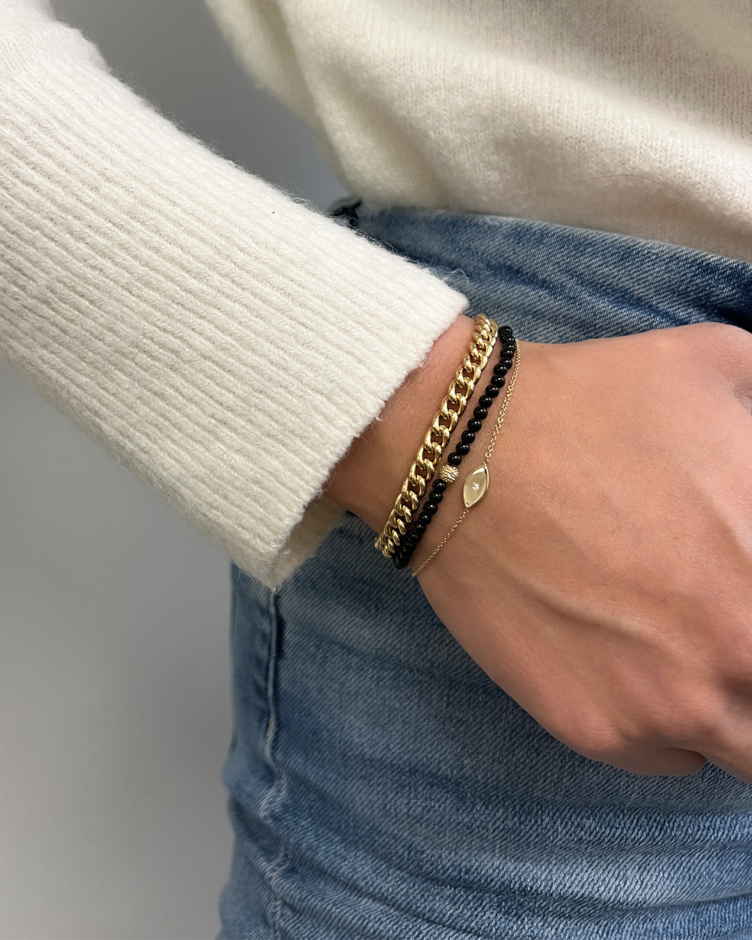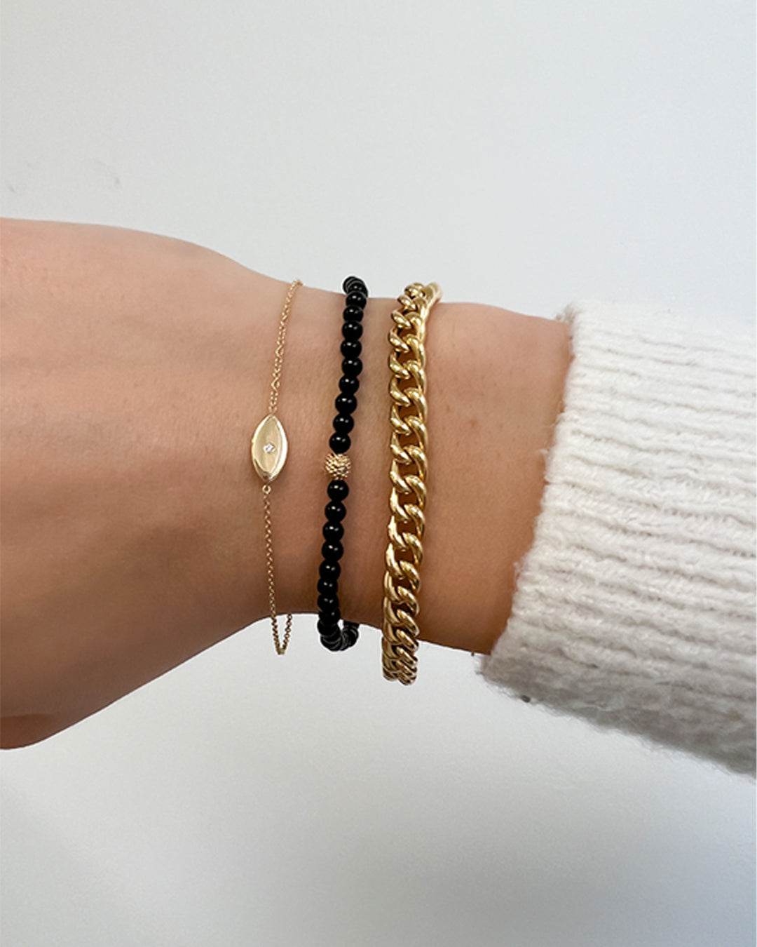 Part of our bead collection, is this fun and chic 3mm black onyx bead bracelet with a single 14k yellow gold diamond bead. With an elastic stretch fit, wear it up or down by itself or stacked with your other fine and fashion bracelets for the perfect arm party.