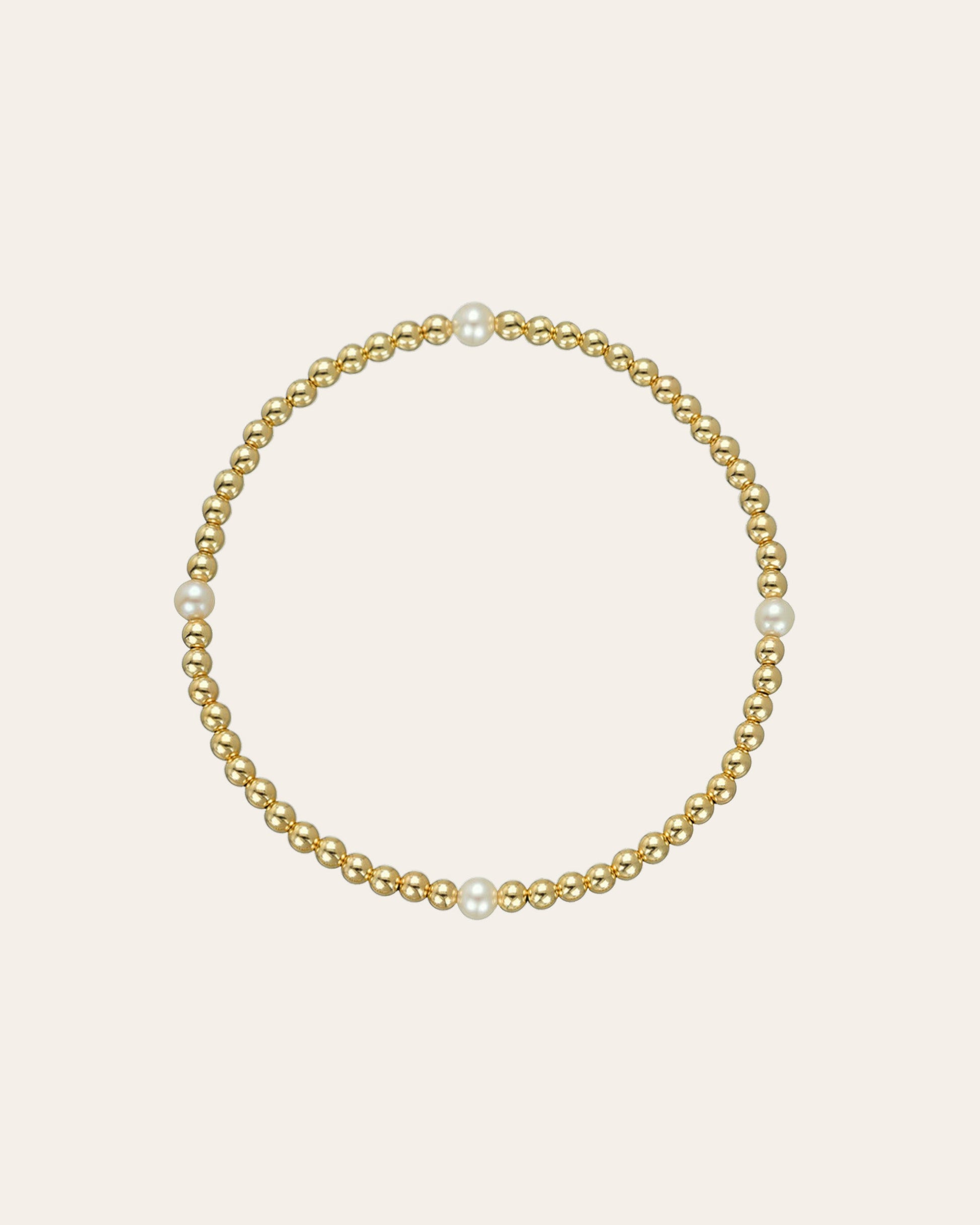 Part of our bead collection, is this fun and chic 3mm gold bead bracelet with 4 pearl beads. With an elastic stretch fit, wear it up or down by itself or stacked with your other fine and fashion bracelets for the perfect arm party.