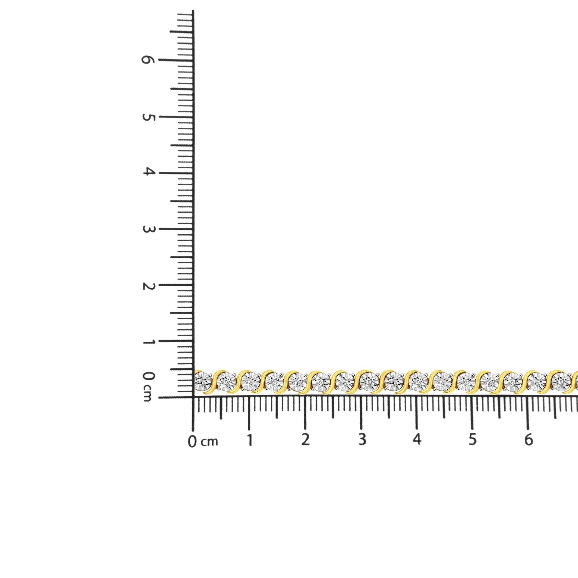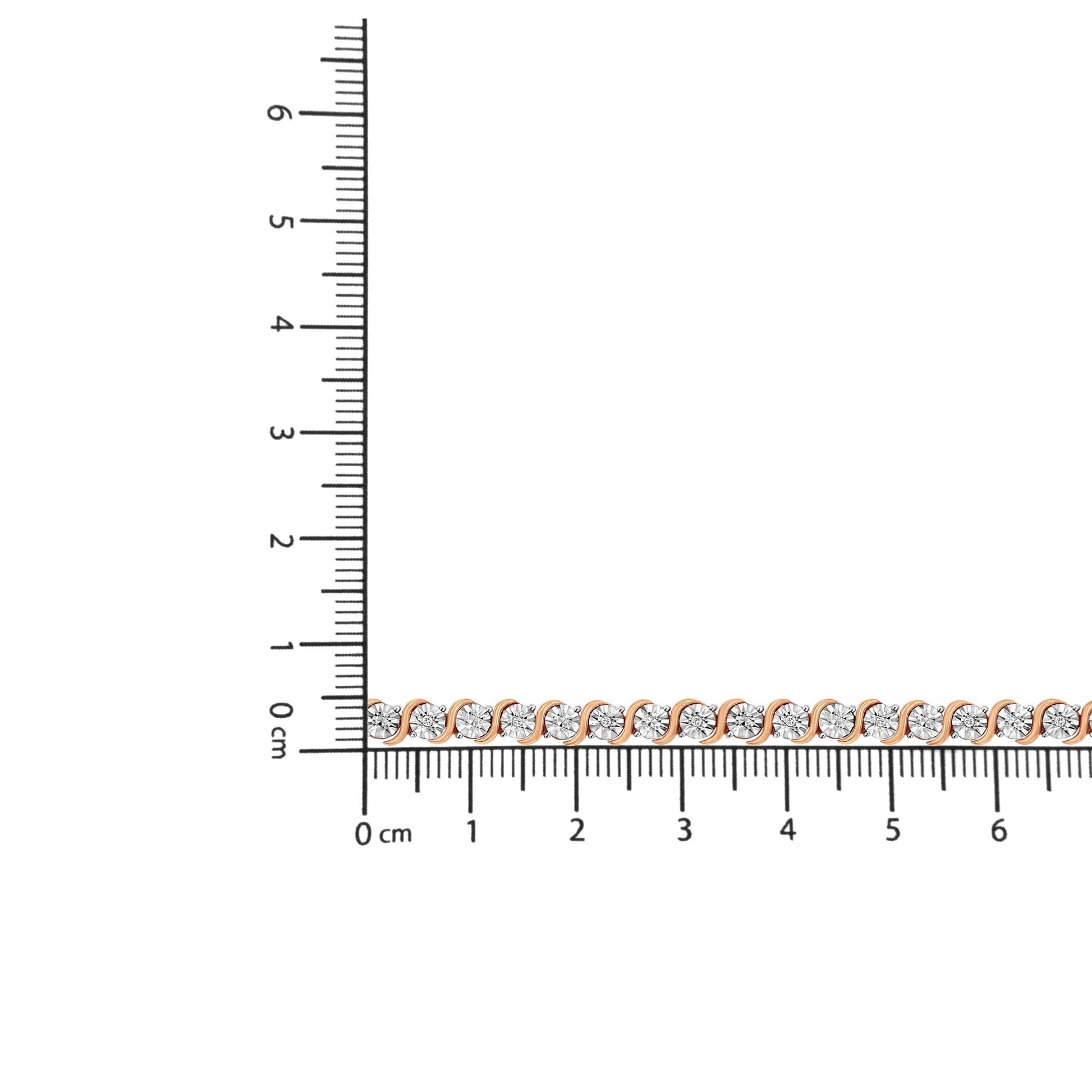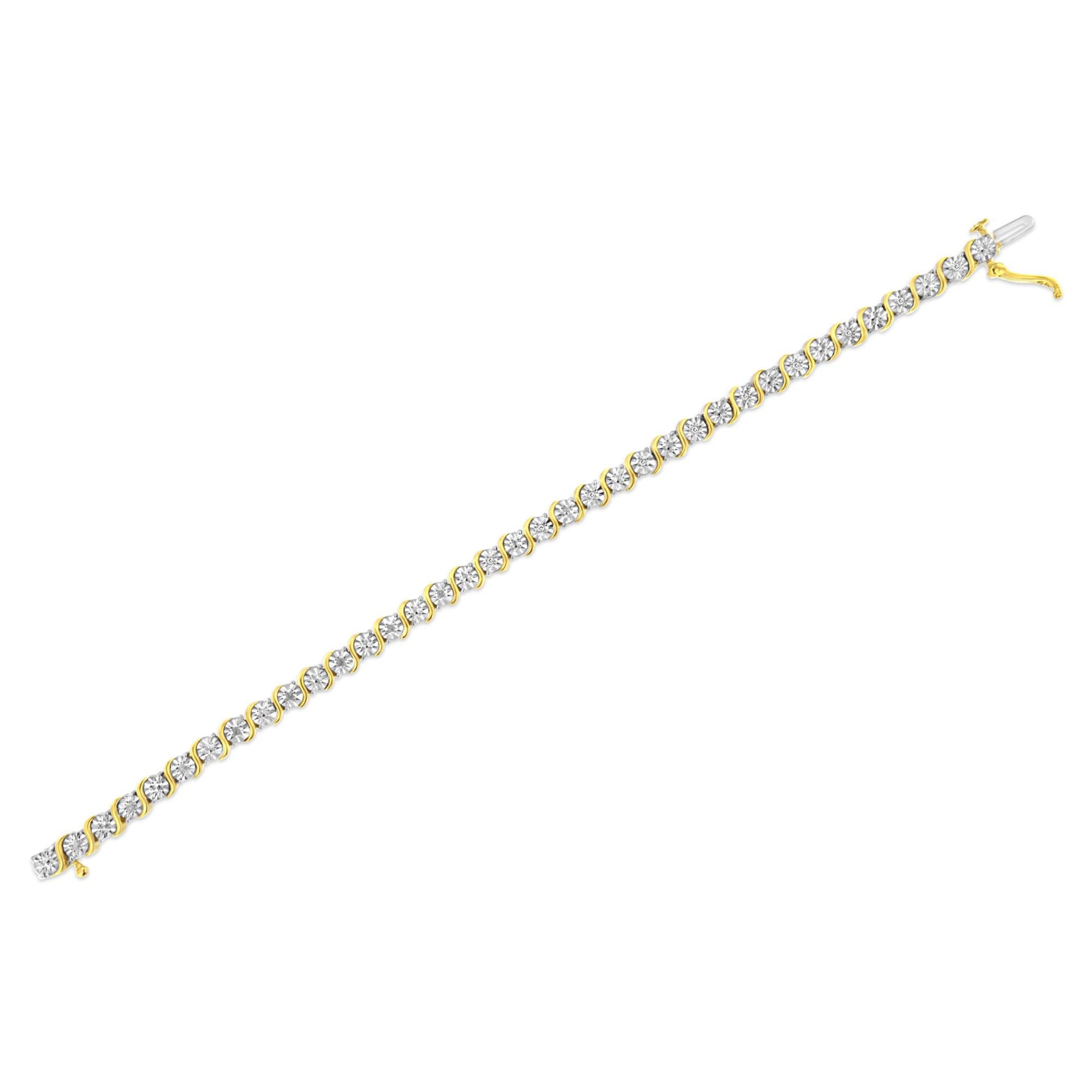 Elegant and timeless, this gorgeous 92.5% sterling silver tennis bracelet features 0.1 carat total weight of natural round brilliant cut white diamonds with 18 individual stones in all. The tennis bracelet has each diamond set into a faceted bezel style miracle plate setting sandwiched between faux bypass style waves of silver. The unique miracle-plate settings center each genuine diamond in a mirror-finish, high-polish frame, giving the illusion of a much larger stone. The 7” long bracelet culminates in a secure box with tongue and safety clasp. The bracelet comes in your choice of rhodium or 14 karat yellow or rose gold plated sterling silver. Whether worn for daytime glamour or evening sparkle, this classic tennis bracelet is gorgeously versatile. It’s a timeless treasure she’ll enjoy wearing every day.