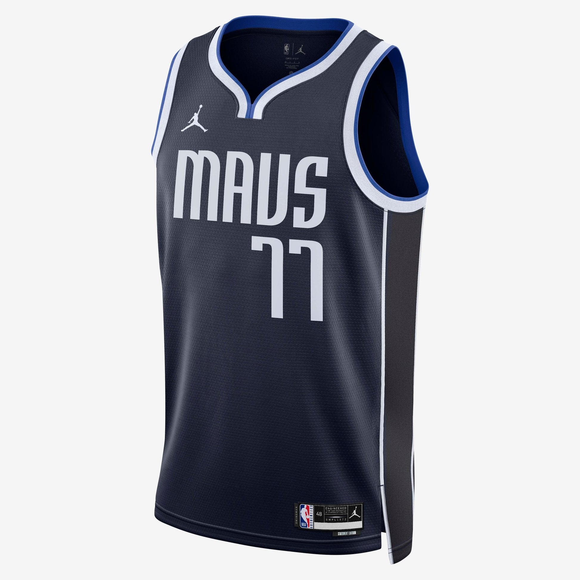 Cheer on Luka Doncic and the Dallas Mavericks in this official Nike Swingman Jersey. Designed for young fans, this navy jersey features authentic team graphics and the iconic number 77. Built with Nike's lightweight, breathable fabric technology, it delivers comfort whether you're watching from the stands or playing in the driveway. The classic Swingman cut provides a comfortable fit for active youth. Perfect for game day or everyday wear for any Mavericks fan.