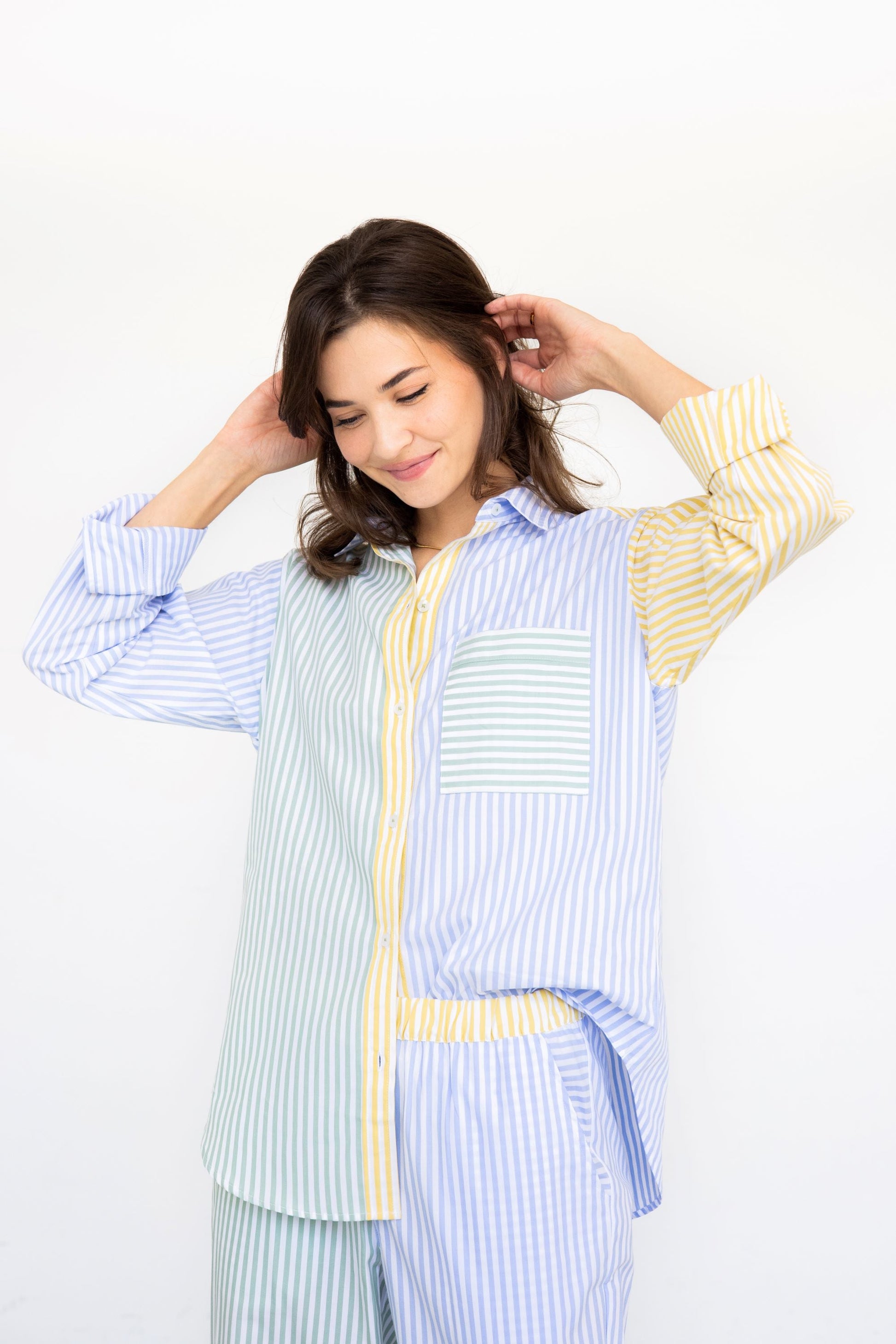 Elevate your sleepwear wardrobe with the full-length version of coastal sophistication. Crafted from fine cotton with a color-block aesthetic, this set offers extra coverage while keeping the breezy ease of resort dressing. The top features structured button-down styling with a chest pocket, and the straight-leg pants include functional side pockets. Perfect for relaxing at home or stepping out for an evening stroll, it transitions effortlessly.