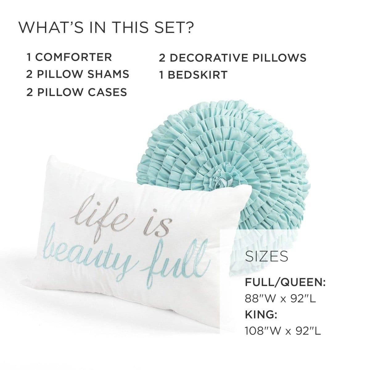 Our Aprile Reversible Comforter 8 Piece Set includes a soft and warm comforter, two shams, two pillowcases, two decorative pillows and one bed skirt, giving you a complete and styled look right out of the bag.
