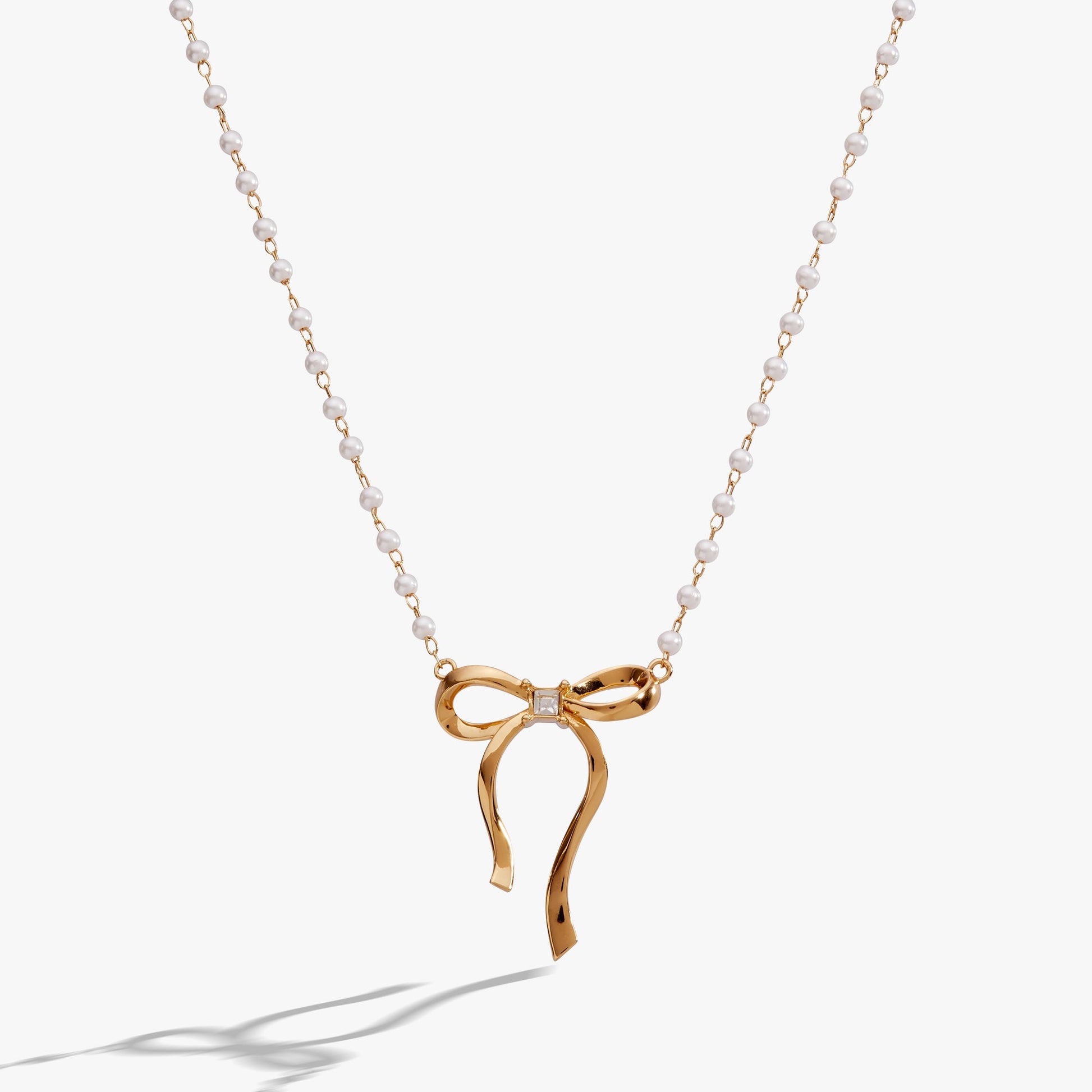 Embrace timeless elegance with this refined pearl necklace, featuring lustrous white pearl beads strung on a delicate rosary chain. A gold-plated dimensional bow adorned with a sparkling clear crystal princess cut stone serves as the striking centerpiece. The intricate craftsmanship delivers an understated luxury that transcends occasion—equally at home layered with everyday pieces or paired with evening wear. A contemporary take on classic femininity, this versatile design bridges modern sensibility with enduring sophistication.