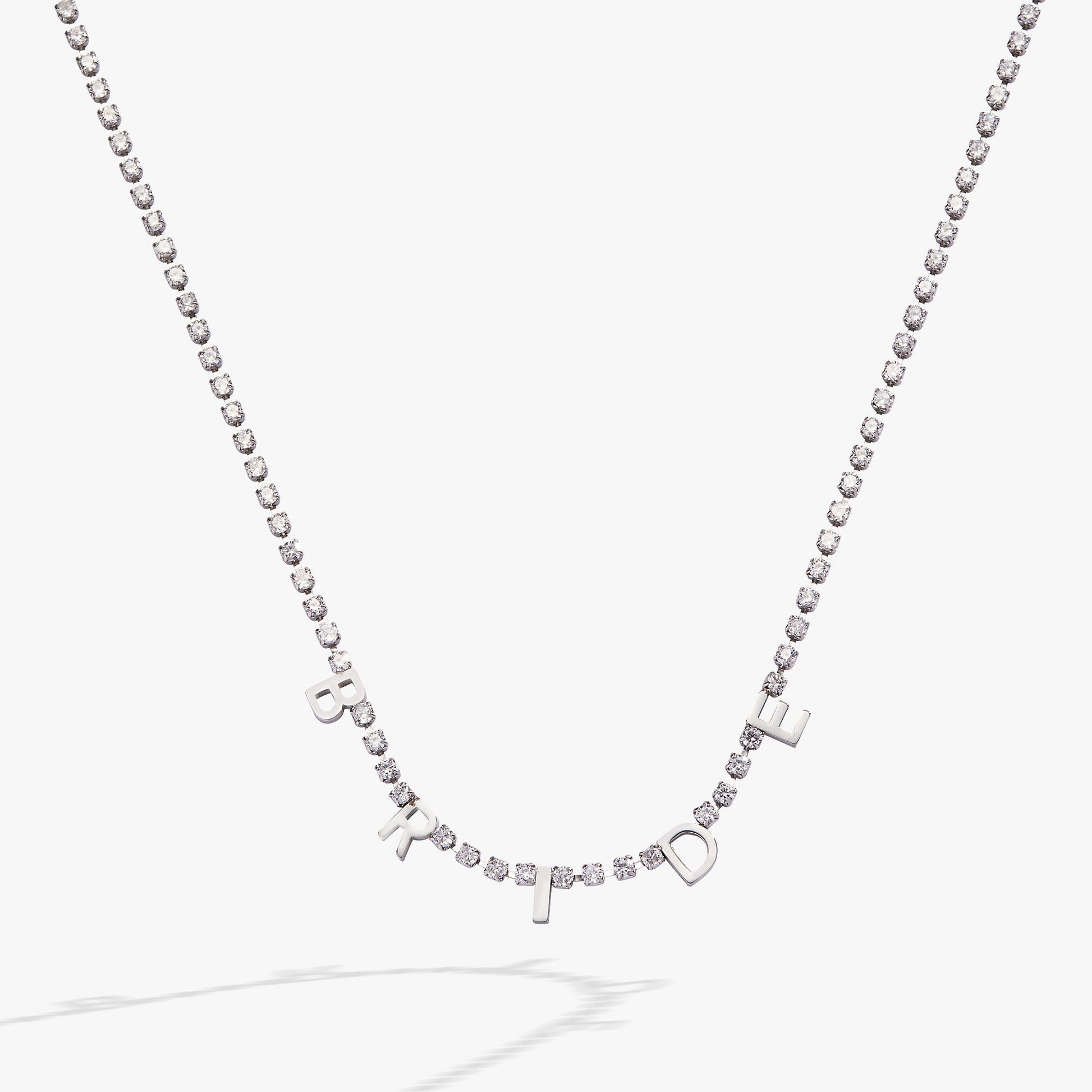 You’re about to make the promise of a lifetime. Celebrate this special moment with this “Bride” Tennis Chain Necklace, which features inline charms that spell out “Bride” on an adjustable-length tennis chain necklace. Because it’s stainless steel, it’s scratch-resistant and durable for everyday wear. Wear it to savor every bit of this special time.