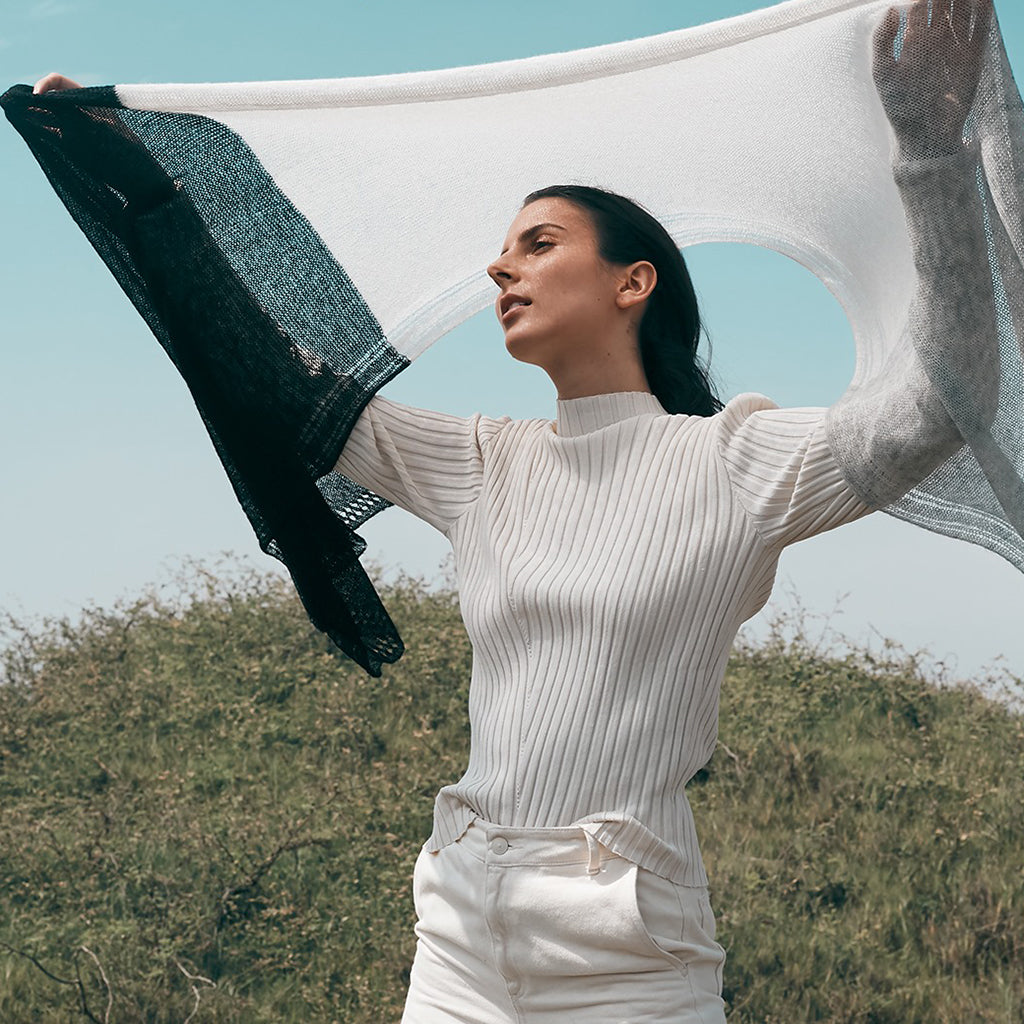 Alpaca fiber is considered by the fashion industry to be one the greenest, most natural and softest fibers in the world. It is prized for its unique silky and luxurious feel and has a lesser tendency to pilling. This timeless scarf is made on a hand knitting machine by a weaving collective in Peru.