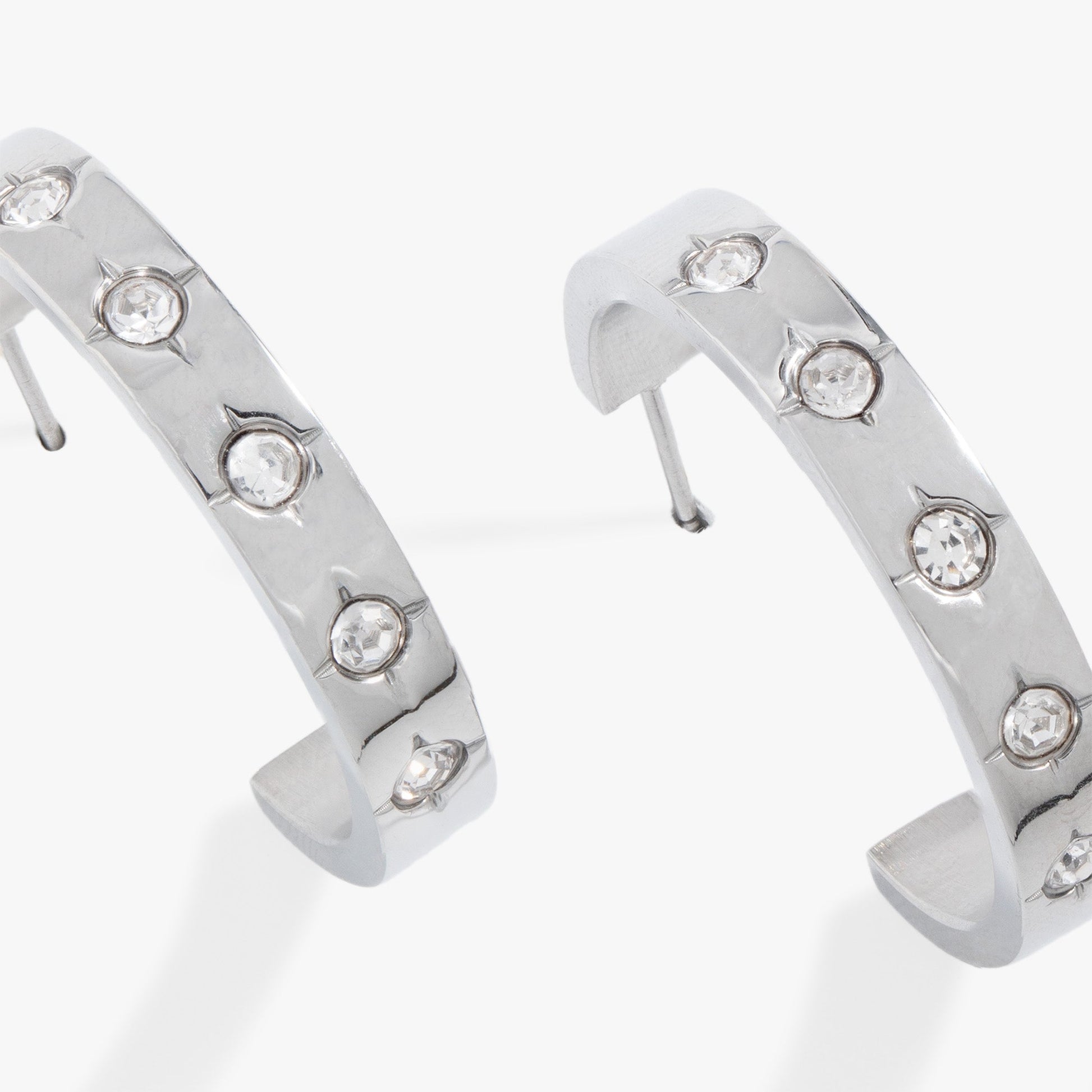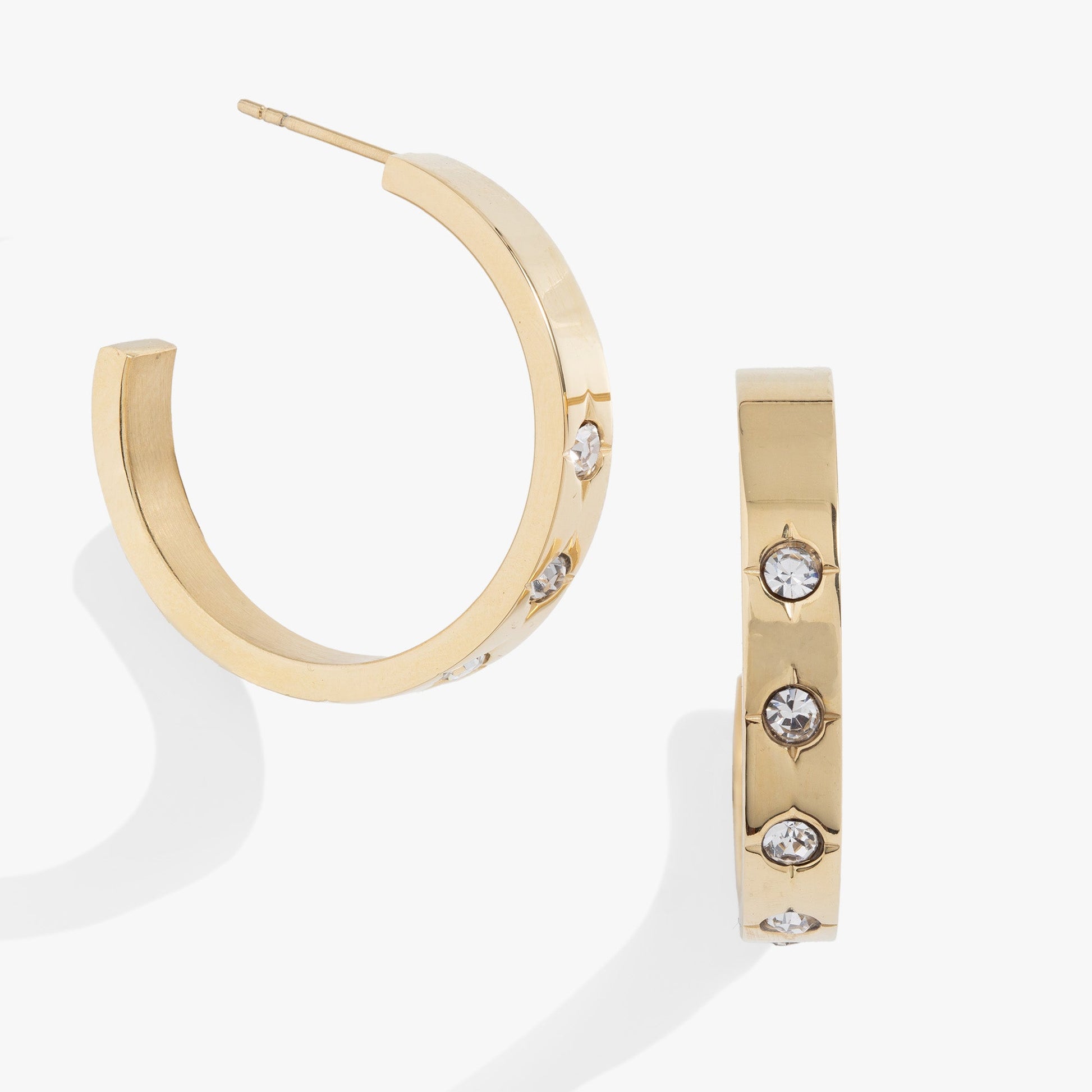 Get a glam refresh when you add the Crystal Accent Hoop Earrings to your everyday look and feel the confidence boost a great pair of earrings gives you! These shiny silver or gold hoops feature crystal-centered star details throughout.