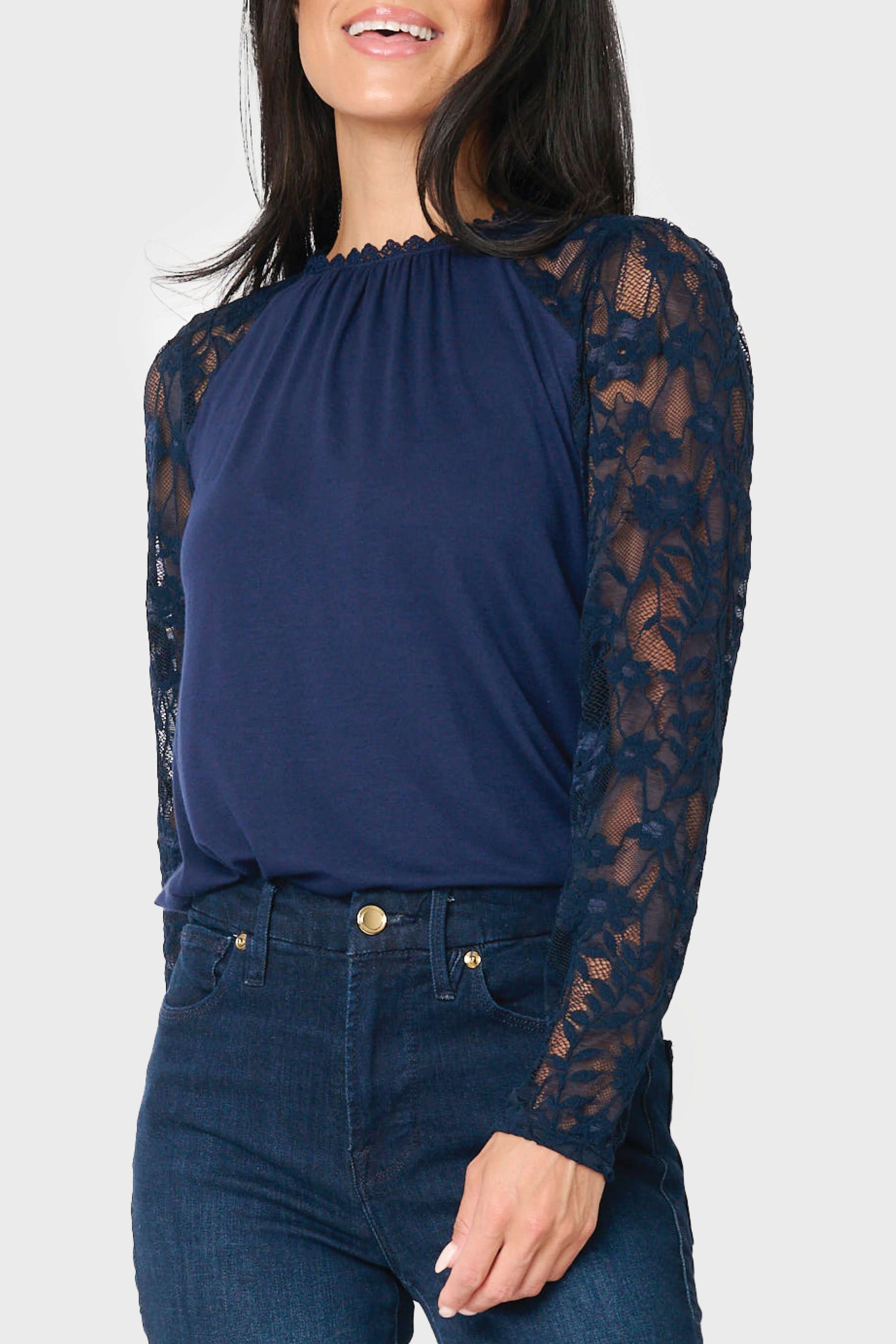 This versatile top adds a touch of romance to any wardrobe. The Cyndi Mixed Knit and Lace Top has long sleeves, a classic crew neck, and an intricate lace sleeve detail to elevate your look.
