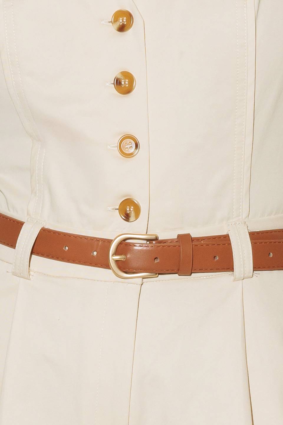A solid woven jumpsuit featuring V neckline, sleeveless, front button/zipper closure, belt, side pockets, wide leg and surplice back with cut out