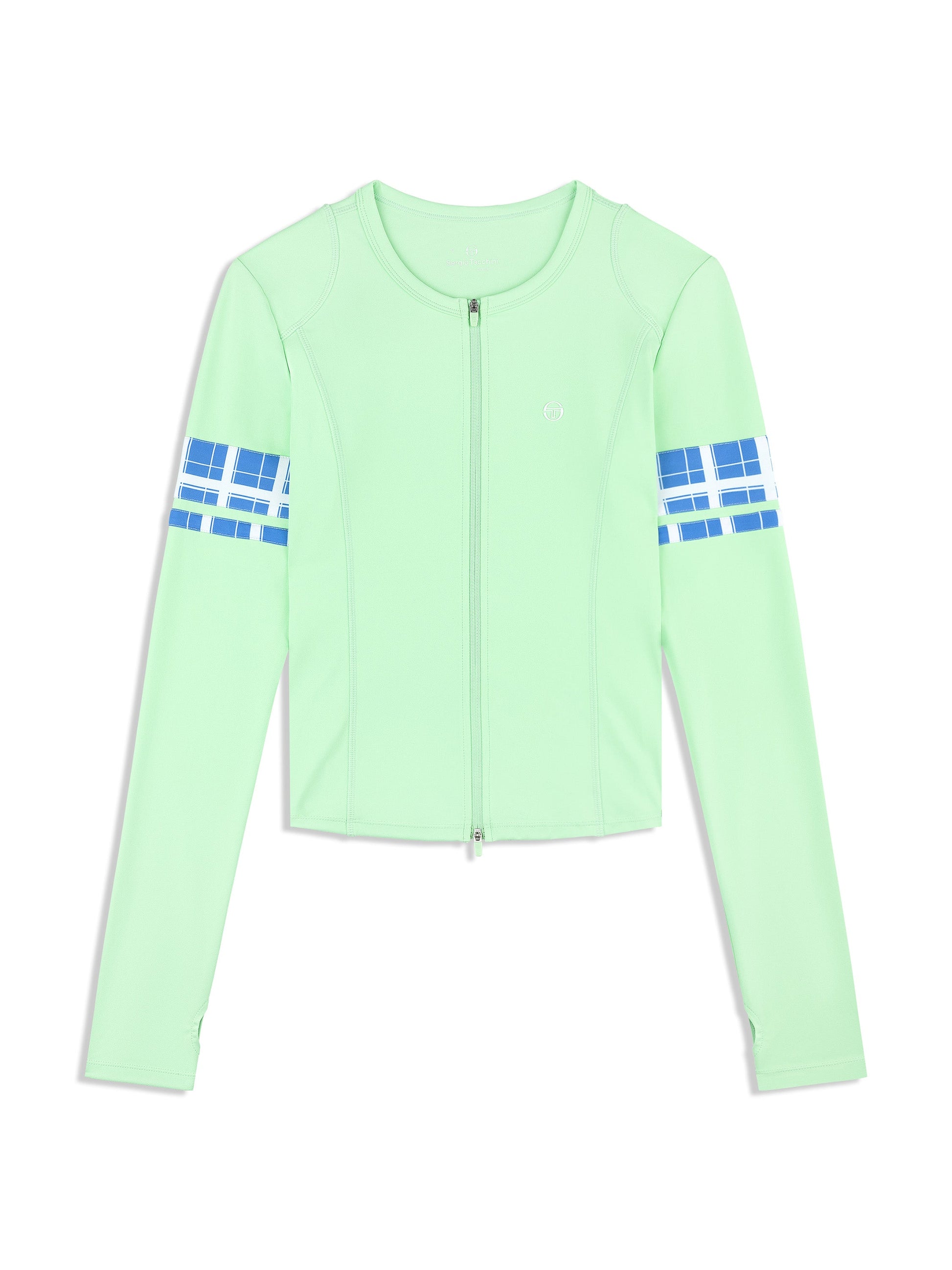 Sleek, sculpted, and built for performance, the Lara Contour Jacket combines athletic function with contemporary style. Crafted from court stretch fabric with moisture-wicking properties, this fitted jacket features princess seams for a flattering silhouette, while custom Damarindo check panels at the sleeves nod to Sergio Tacchini's heritage. Finished with handy thumbholes for added coverage and a 2-way zipper for versatile styling, it's the perfect layer for warming up, cooling down, or making a statement off the court.