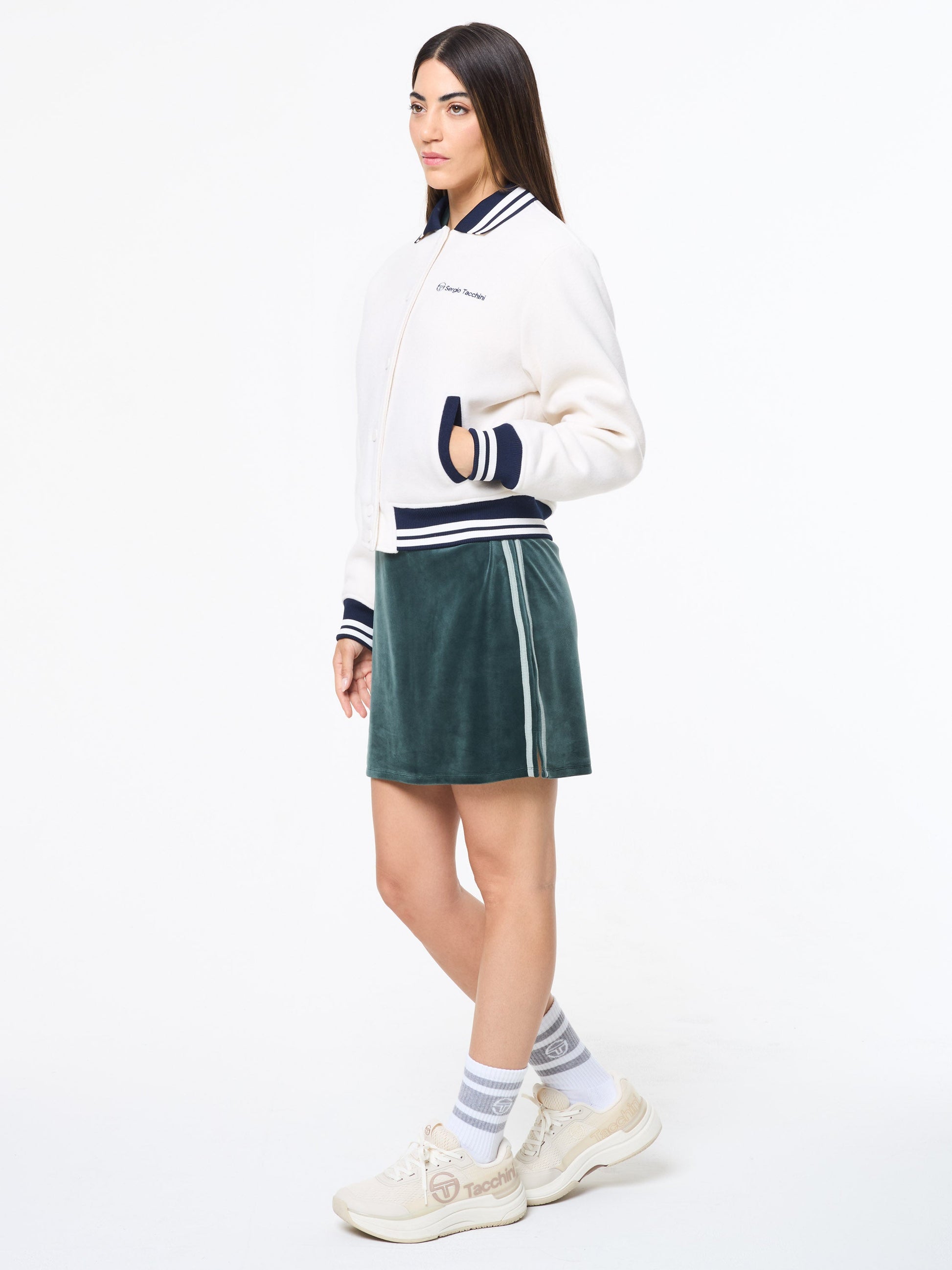 A modern take on classic collegiate style, the Marisa Varsity Jacket is crafted from a warm and durable melton wool blend for a luxurious feel. Featuring tipping stripe accents at the rib-knit trims, this premium jacket is finished with contrast pops at the handwarmer pockets for a refined athletic edge. Timeless, elevated, and built for everyday wear.