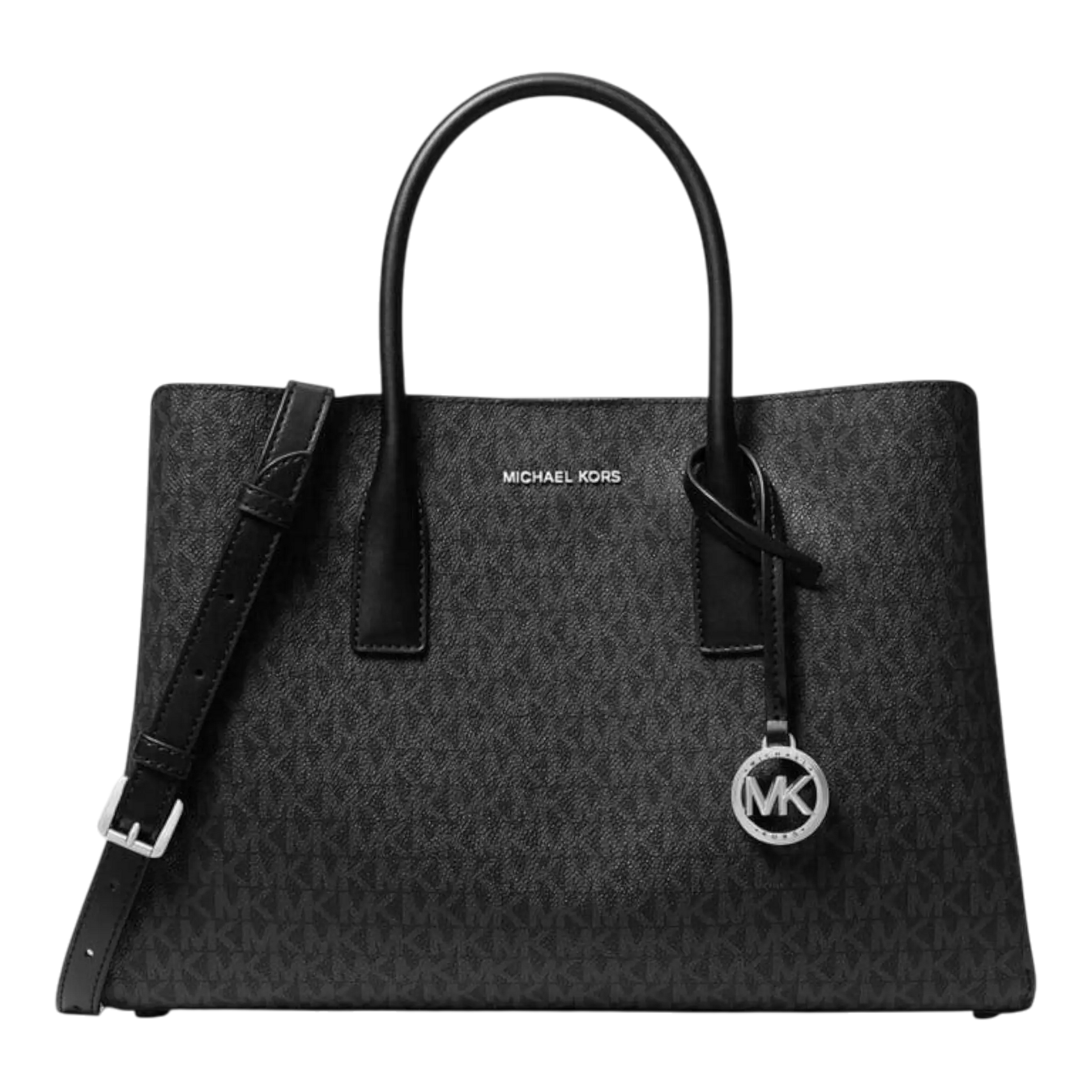 - Classic black logo print exterior and signature MK charm detail create a refined, timeless look for any occasion.