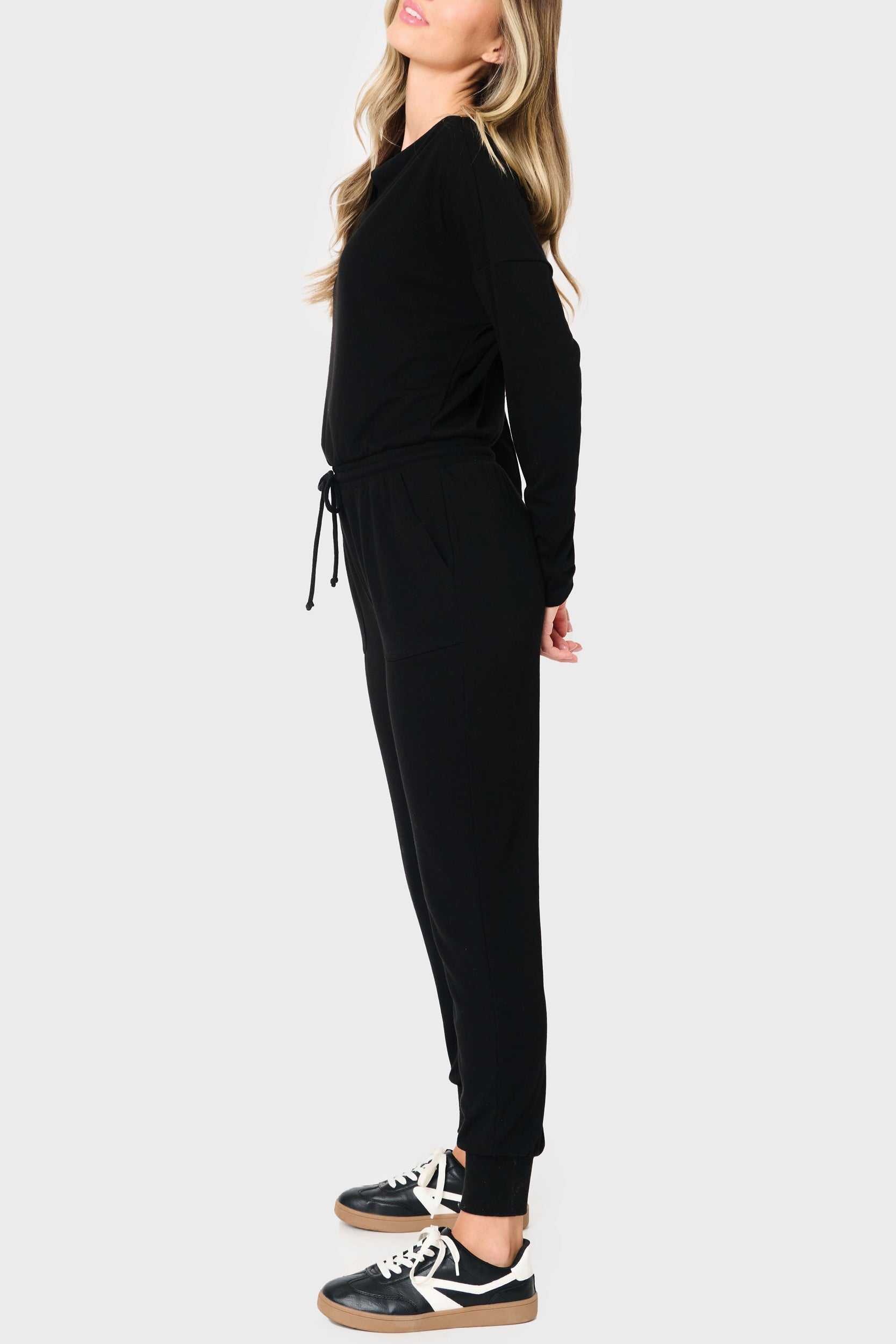 The elastic drawstring waist flatters your figure while maintaining a comfortable, easy fit, and the tapered leg creates a sleek silhouette perfect for lounging at home, running errands, or going out in style. Lightweight yet luxe, this slouchy jumpsuit transitions seamlessly from day to night, just switch up your accessories and footwear.