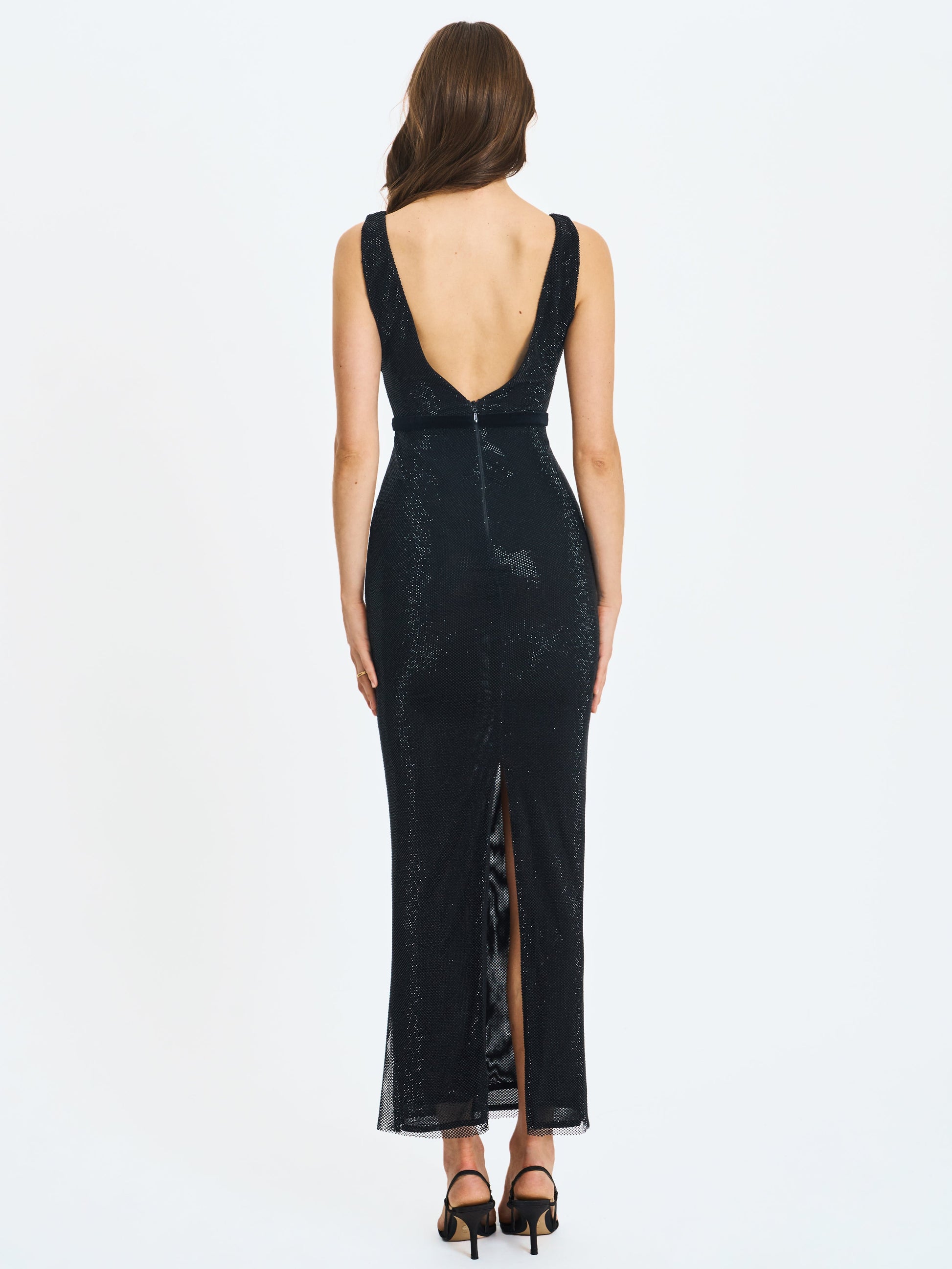 Turn every entrance into a spotlight moment with the Olympia Dress—a floor-sweeping stunner that’s equal parts sparkle and sophistication. Designed in sheer black mesh drenched in rhinestones, this deep V-neck silhouette delivers serious holiday glamour, balanced by a nude illusion panel that keeps everything confidently in place. A plush, high-waisted velvet bow cinches the waist with festive charm, giving just the right amount of contrast and drama. Fully lined in mesh for breathability and ease, and finished with an invisible back zipper, this dress is your go-to for winter galas, midnight toasts, or any occasion where being the brightest in the room isn’t just a goal, it’s the dress code.