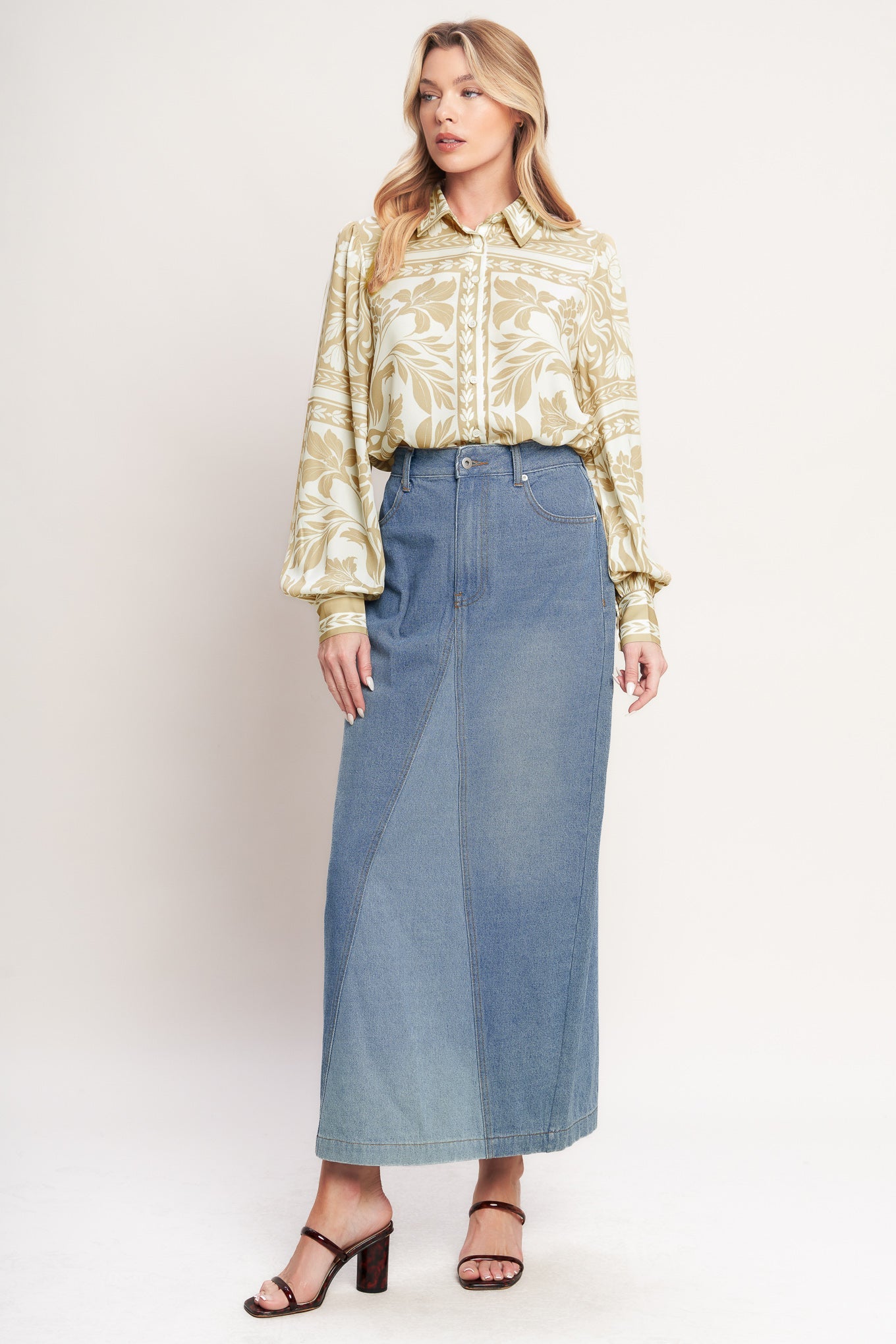 A printed woven top featuring collar, button down and long sleeve. Matching skort IP9190T