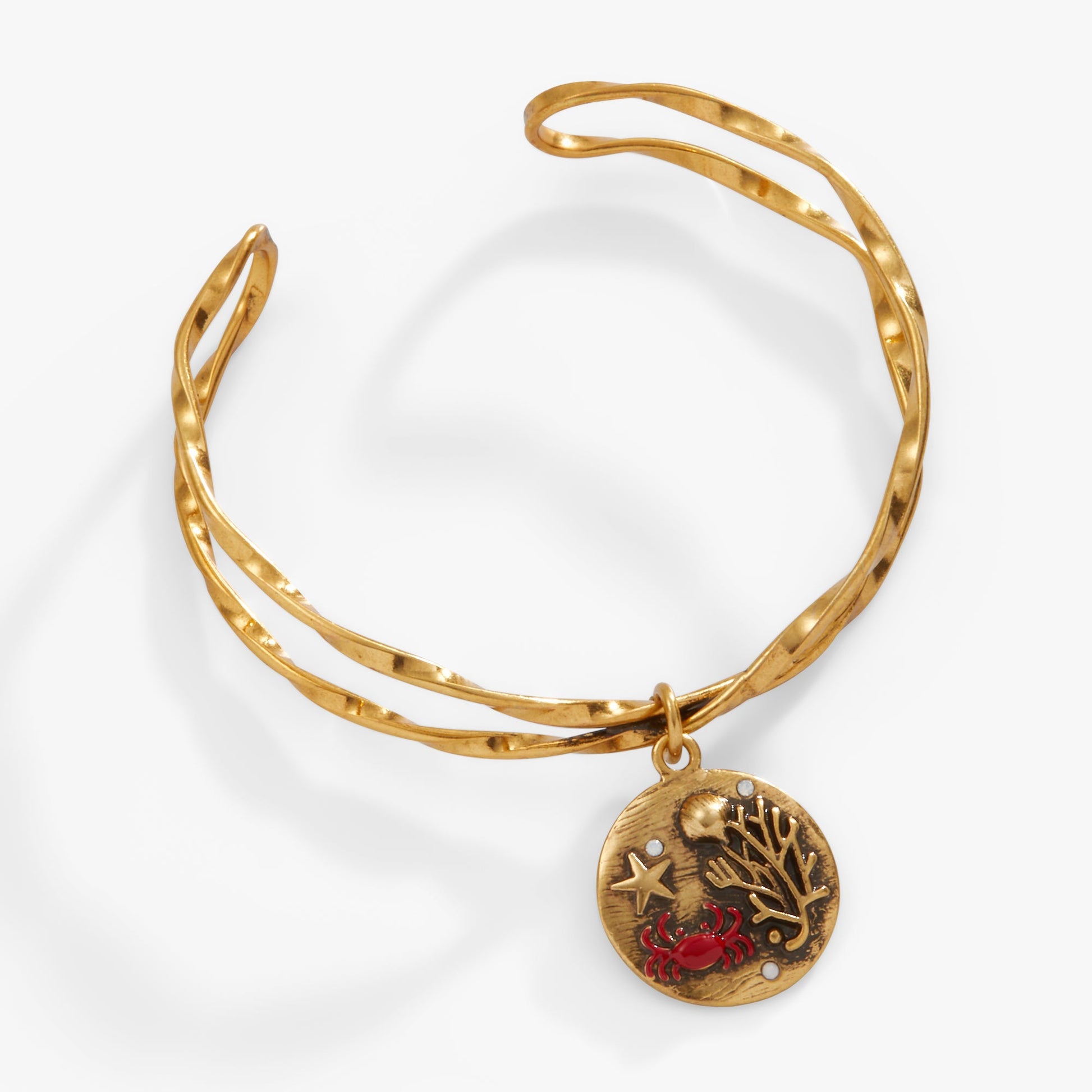 Bring the ocean's beauty wherever you go with this stunning hammered twist cuff. Featuring a textured metal seascape charm, complete with charming details like coral and a little red crab, this bracelet will add texture and sparkle to any look.